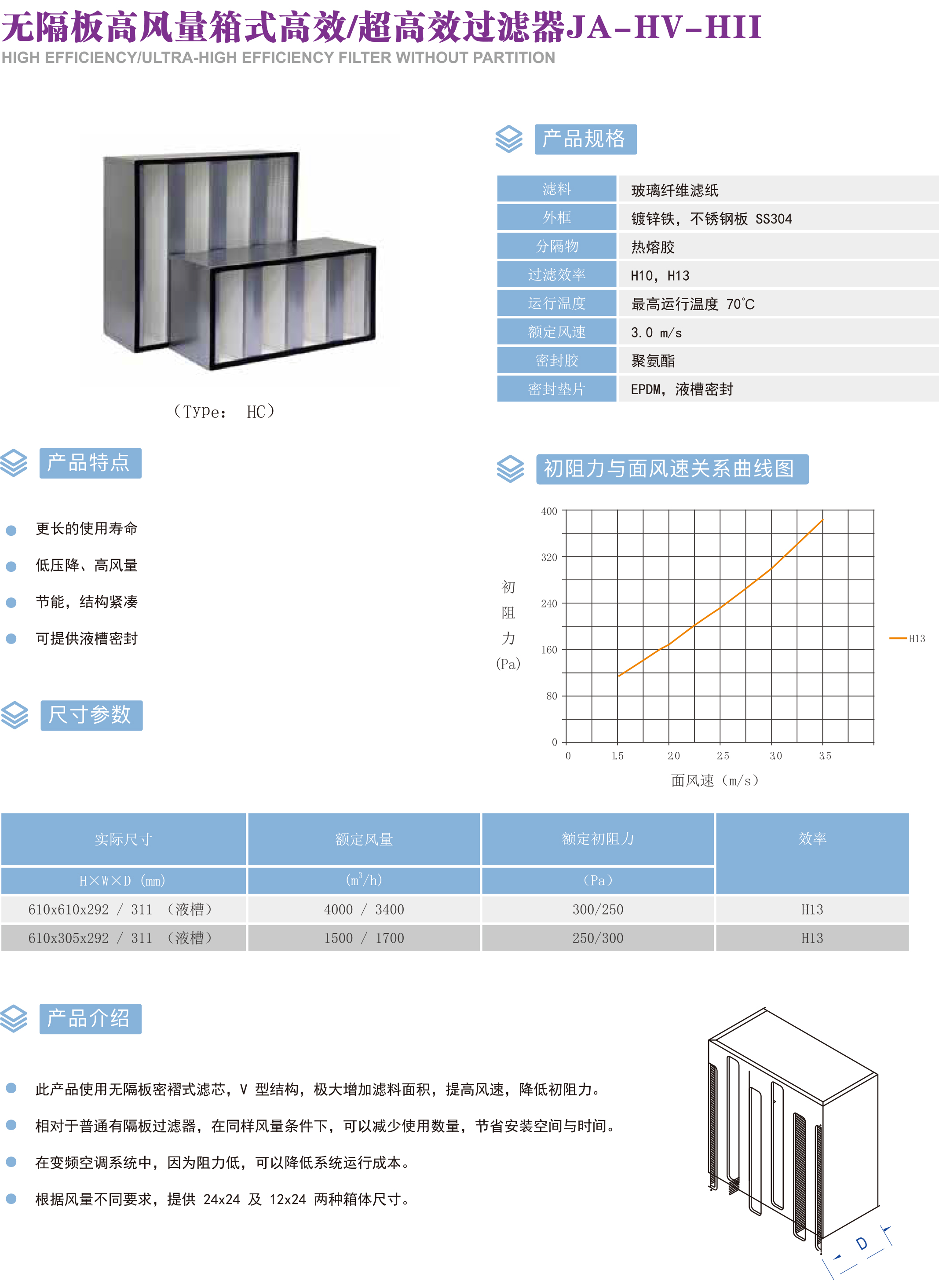 无隔板高风量箱式高效/超高效过滤器JA-HV-HII
